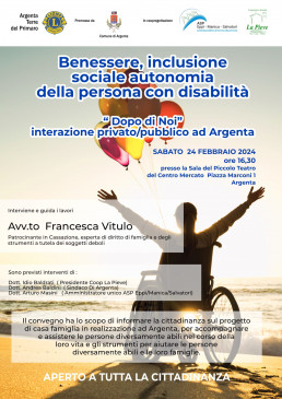 Sabato 24.02.2024 alle ore 16,30 presso il Centro Culturale Mercato ad Argenta si tiene il Convegno "Benessere, Inclusione Sociale e Autonomia della Persona con Disabilità".